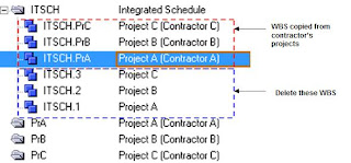 When you get the revised schedules from contractors go back to Step-4, 5 and 6 and 7 accordingly. Make sure all projects have the same data date. Fix the broken links as the links done in Step -1 will be lost when you delete the existing WBS (shown in Step-6).