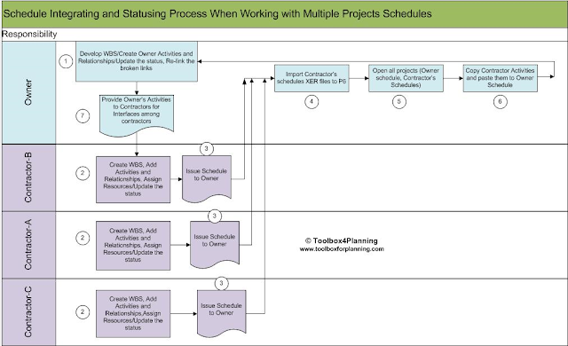 The following diagram shows the process of work flow when multiple schedule are integrated into one. Suppose your schedule containing owner’s activities has been developed (Step-1) and the three contractor schedules required to integrate into your schedule have been issued to you (Step-3).